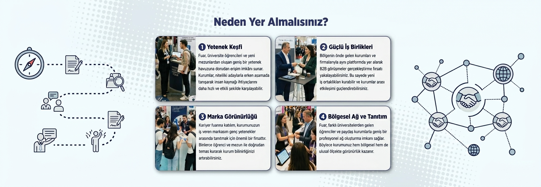 Şirketler, staj programları ve yeni mezunlar için özel olarak tasarladıkları iş imkanlarını tanıtır. Katılımcılar, doğrudan şirket temsilcileriyle iletişim kurarak başvuru süreçleri ve beklentiler hakkında bilgi alabilir.